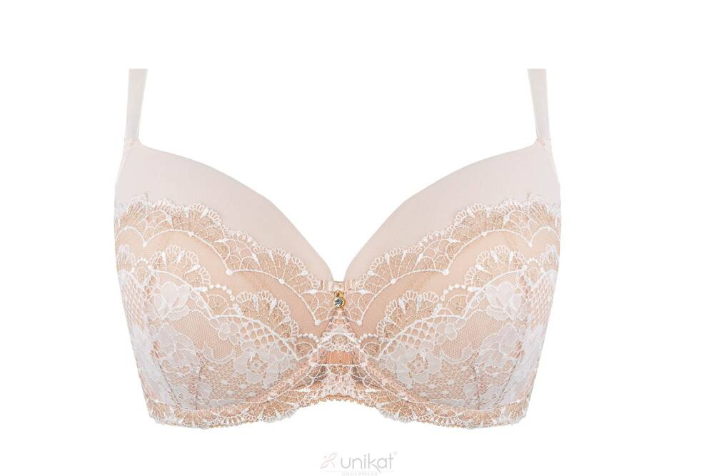 Biustonosz o klasycznym kroju. Doskonale podkreśla średnie i duże biusty. Formuje piersi w pożądany, okrągły kształt. Ramiączka są nieodpinane, z możliwością regulacji na całej długości, szerokością dopasowane do wielkości miseczek. Zapięcia trzystopniowe na dwa lub trzy rzędy haftek.