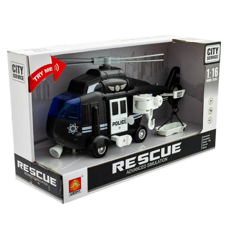 Zapytaj o produktZabawka helikopter policyjny. Posiada napęd rozpędzany, gumowe koła, przyciski dźwiękowe oraz efekty świetlne. Dodatkowo posiada mechanizm poruszania śmigłem po wciśnięciu przycisku znajdującego się pod drzwiami helikoptera. W zestawie znajduje się również kosz ratunkowy, który można zawiesić na rozwijalnym haku z boku zabawki.