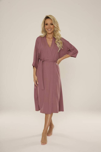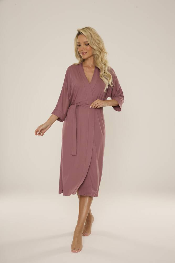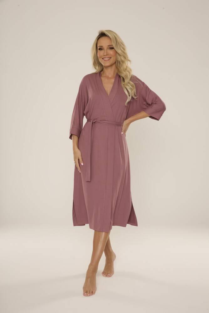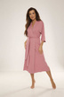 Model o dłuższym kroju doskonale otula ciało, a rękawy 3/4 i wiązanie w pasie podkreślają talię, dodając całości lekkości i kobiecości.