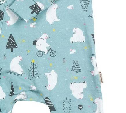 Bawełniany, wzorzysty pajac. Możliwość całkowitego rozpięcia umożliwia łatwe i szybkie ubieranie dziecka. Dodatkowy klin w kroku i stopery nad pietami zapewniają swobodę użytkowania i nie krępują ruchów dziecka.