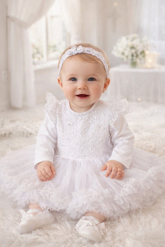 Sukienka wykonana jest z najwyższej jakości dzianiny.  Jakość dzianiny zapewnia maksymalny komfort noszenia (elastyczna, mięciutka, oporna na zagniecenia). Sprawdzi się na chrzest i inne uroczystości.