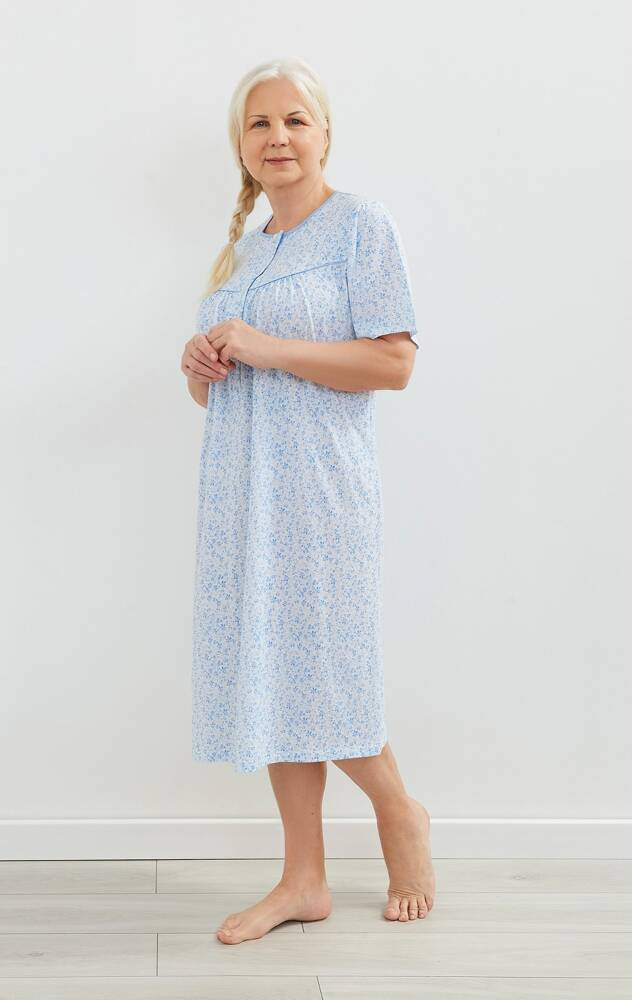 Damska rozpinana koszula nocna z  krótkim rękawem   to doskonała propozycja zarówno na lato, jak i na chłodniejsze noce. Przyjemna dla skóry 100% bawełna zapewni odpowiedni komfort termiczny, a delikatny, kwiatowy motyw przypadnie do gustu każdej kobiecie. Damska koszula nocna jest rozpinana na dekolcie, dzięki czemu idealnie nadaje się dla kobiet karmiących. Ta bawełniana damska koszula do spania to gwarancja wygody i swobody każdej nocy. Damska koszula nocna dostępna jest w rozmiarach od M do XXXL