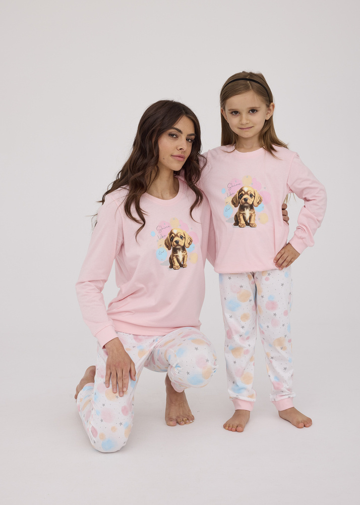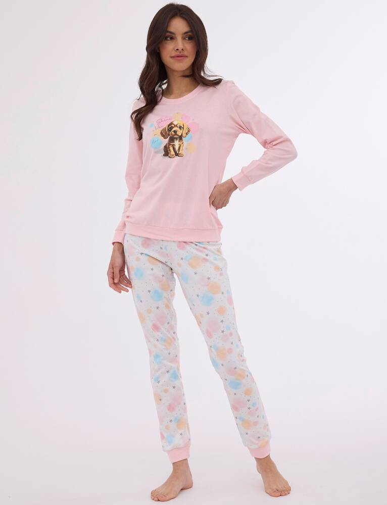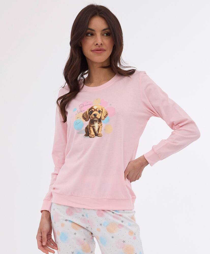 Wygodna piżama damska wykonana z wysokiej jakości wyjątkowo miłej i miękkiej bawełny. Koszulka z długim rękawem, przód ozdobiony kolorowym nadrukiem. Do kompletu długie wzorzyste spodnie. Dekolt, mankiety oraz dół koszulki z nogawki zakończone wygodnym ściągaczem. Piżamka pakowana w pudełko.