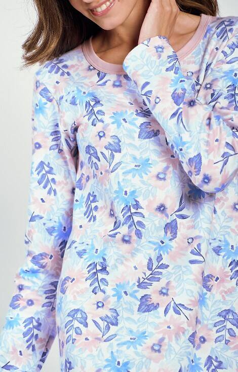 Koszula damska z długim rękawem . Całość uszyta z wysokiej jakości wzorzystej bawełny interlock . Okrągły dekolt. Długość do kolana .