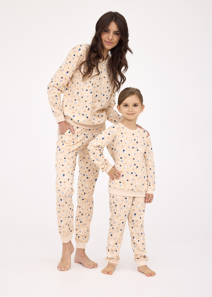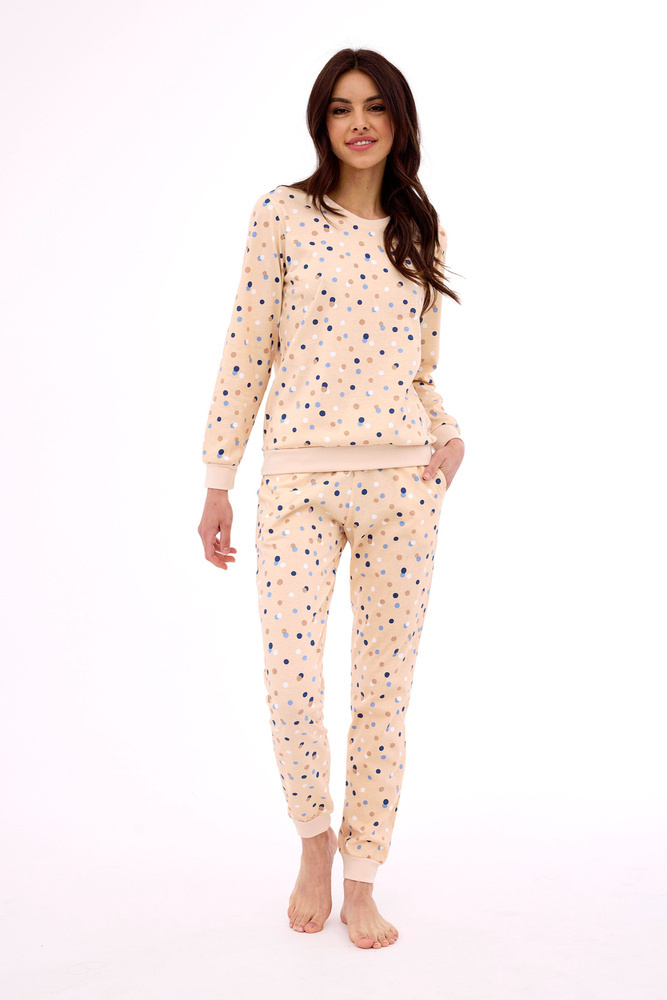 Wygodna piżama damska wykonana z wysokiej jakości wyjątkowo miłej i miękkiej bawełny. Bluzka z długim rękawem, zakończonym ściągaczem, dekolt okrągły. Do kompletu długie spodnie z kieszeniami, nogawki zakończone ściągaczem. Pakowana w pudełko.
