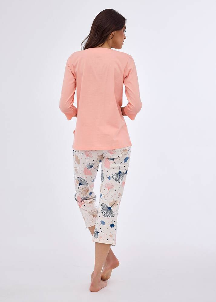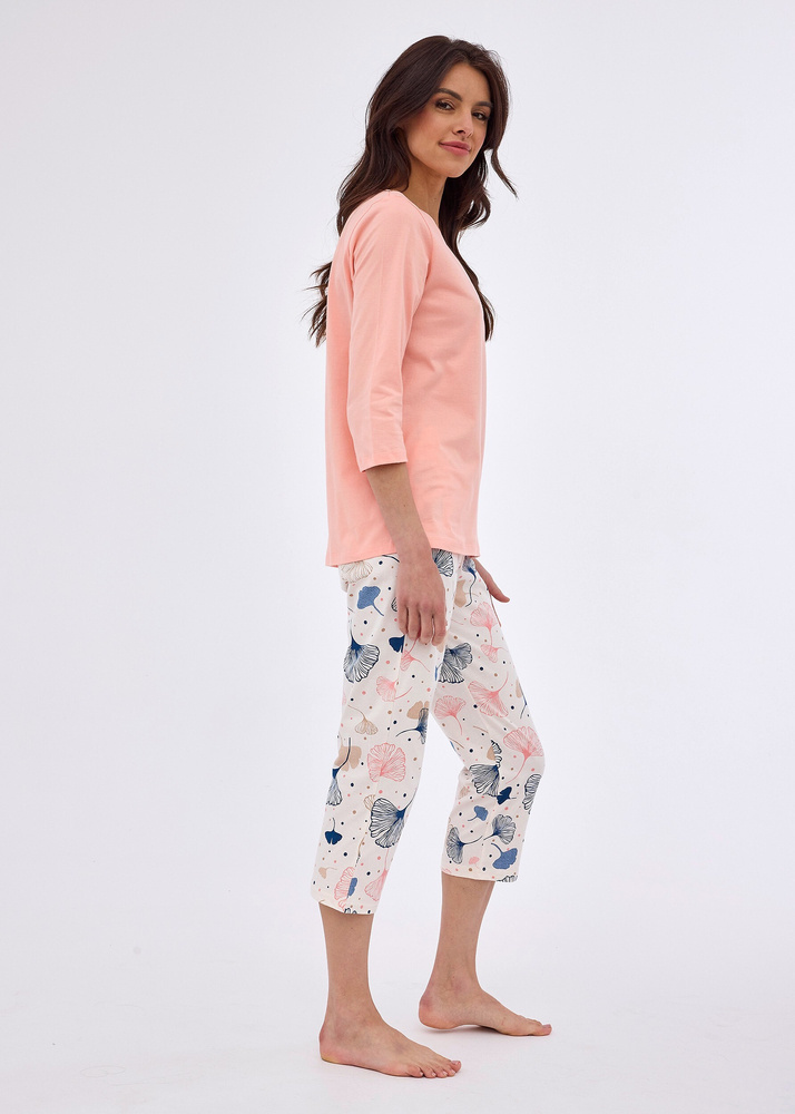 Wygodna piżama damska wykonana z wysokiej jakości wyjątkowo miłej i miękkiej bawełny. Model z rękawem długości 3/4, uszyta z jednolitej bawełny, Dekolt w serek, do kompletu wzorzyste spodnie długości 3/4. Pakowana w pudełko.