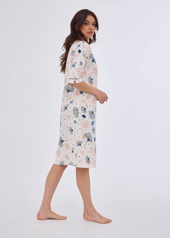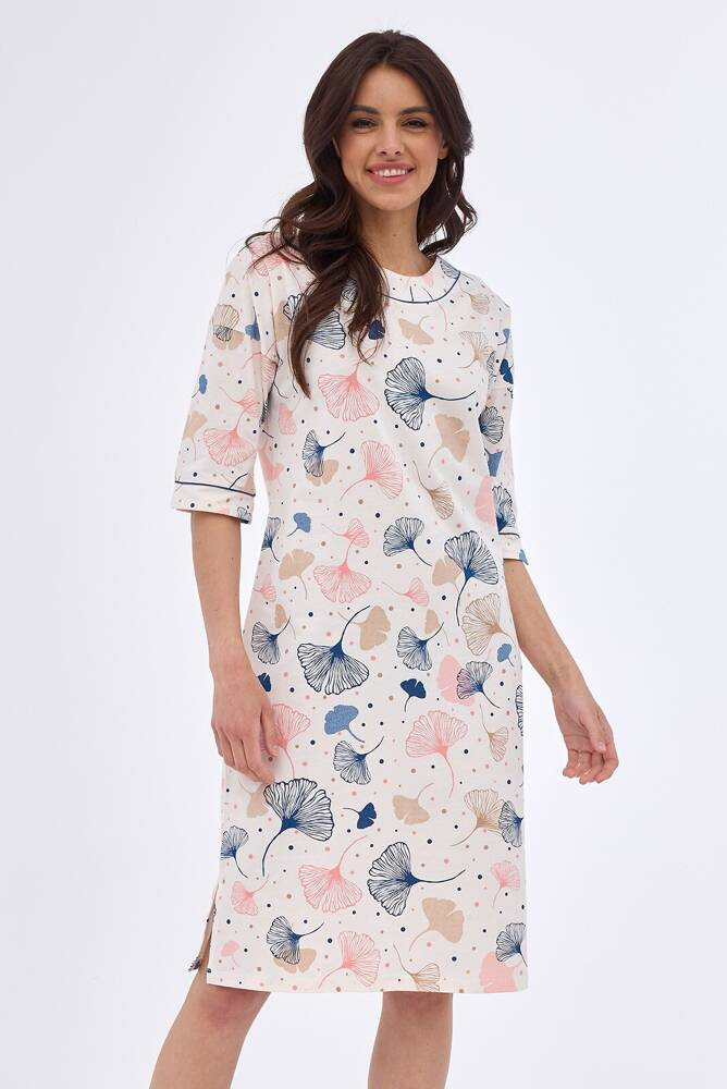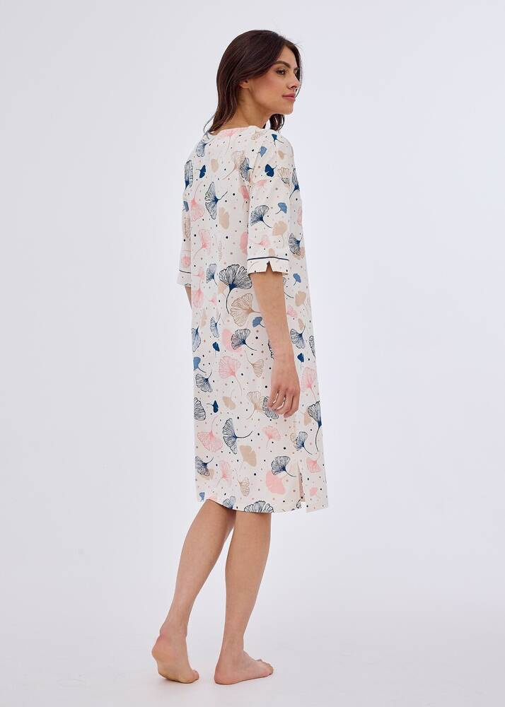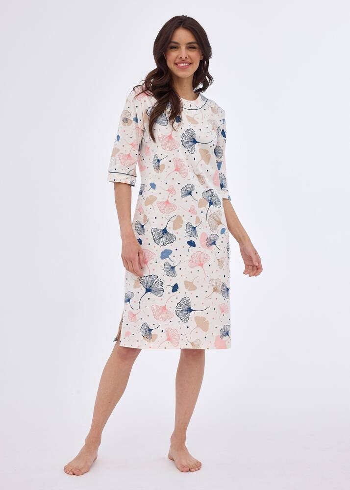 Bawełniana koszula nocna wykonana z wysokiej jakości bawełny. Model z rękawem długości 3/4 uszyta z wzorzystej bawełny, dekolt okragły, długość za kolano. Pakowana w pudełko.