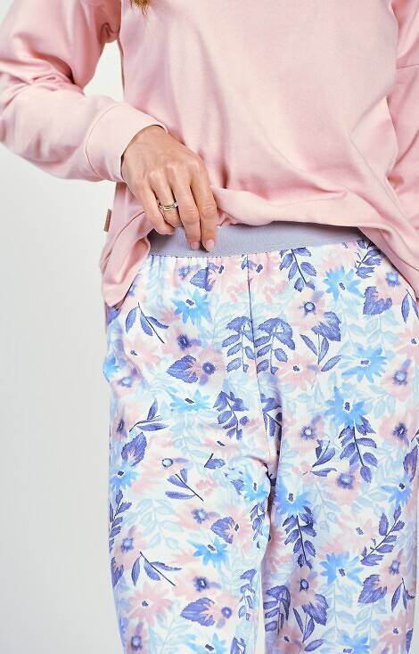 Do kompletu długie spodnie zakończone ściągaczem.  Spodnie w kwiaty , koszulka jednolite.