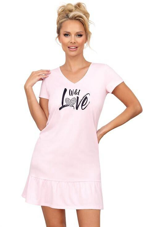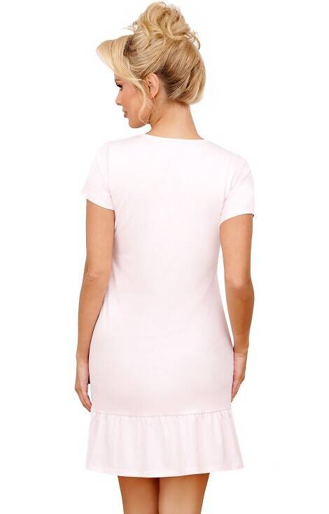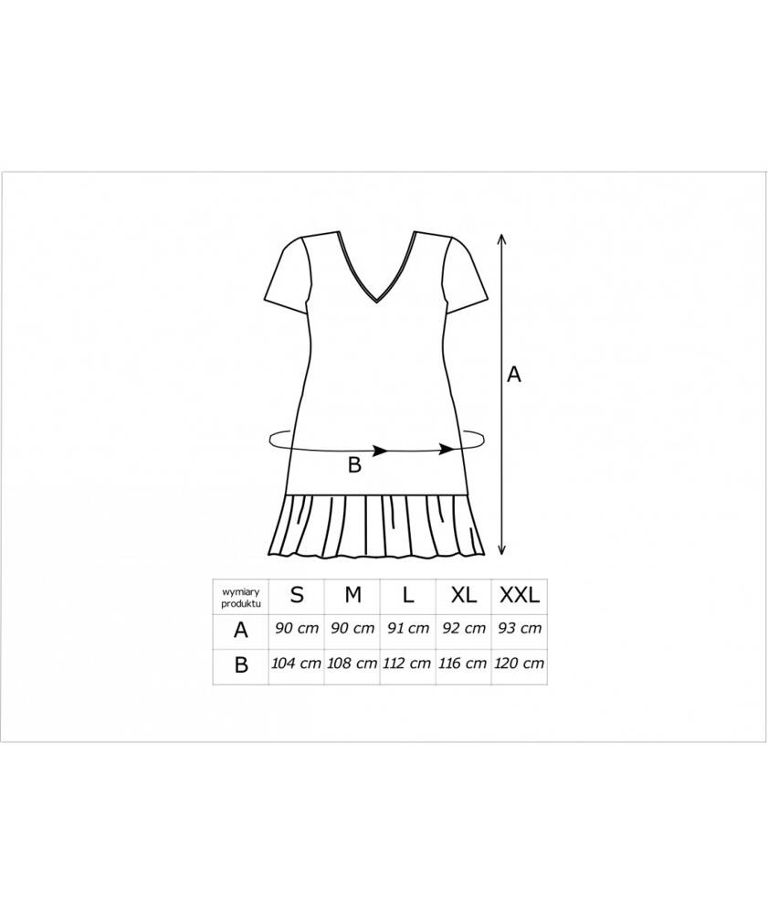 Letnia koszula damska z delikatnej bawełny z krótkim rękawem. Dekolt w kształcie litery "V". Z przodu ozdobna grafika. Dół zakończony marszczoną falbaną.