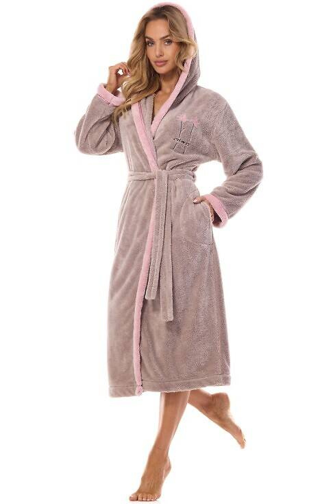 Długi szlafrok damski z kapturem ozdobiony delikatną aplikacją