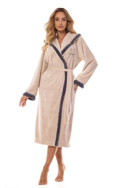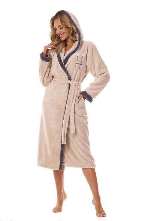 Długi szlafrok damski z kapturem ozdobiony delikatną aplikacją