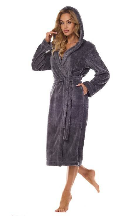 Długi szlafrok damski z kapturem ozdobionym haftem w gwiazdki.