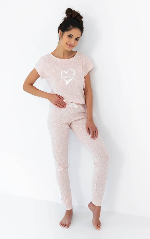 Piżama damska wykonana z bawełny. Koszulka z krótkim rękawem, dekolt okrągły. Do kompletu luźne, długie spodnie. Nogawki proste , zakończone ściągaczem.