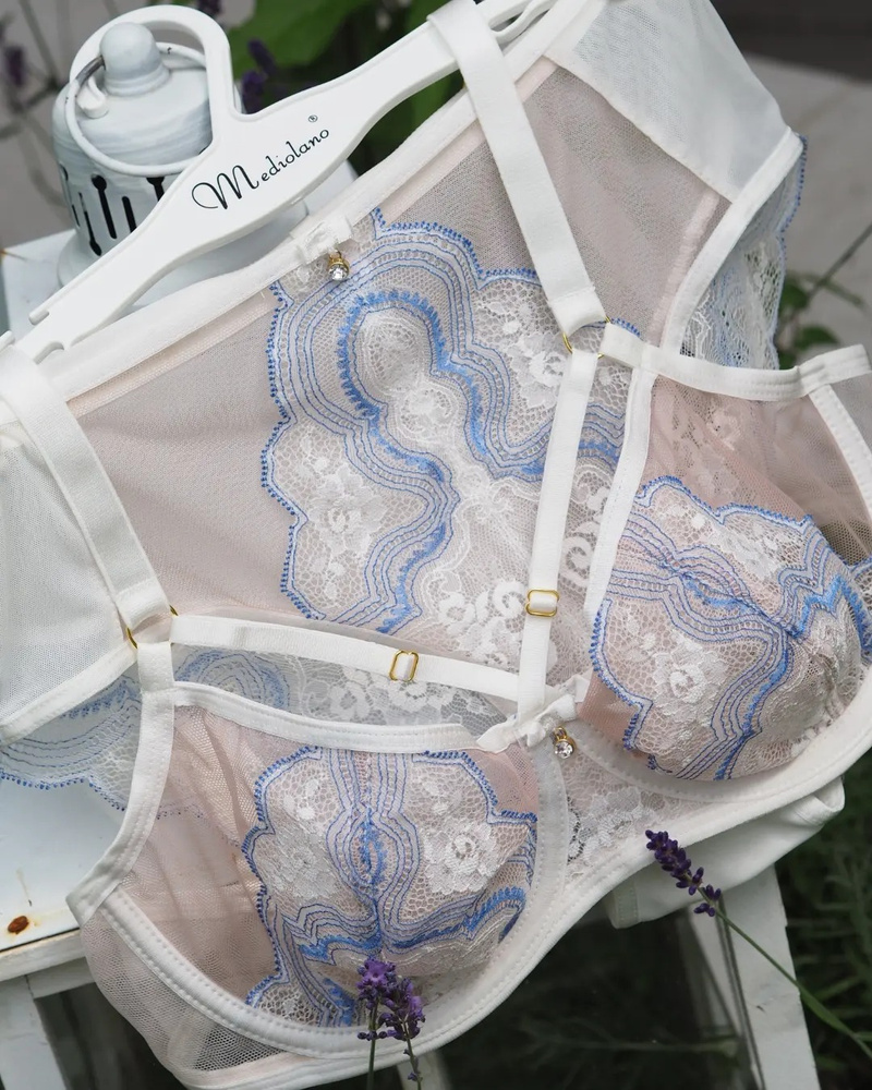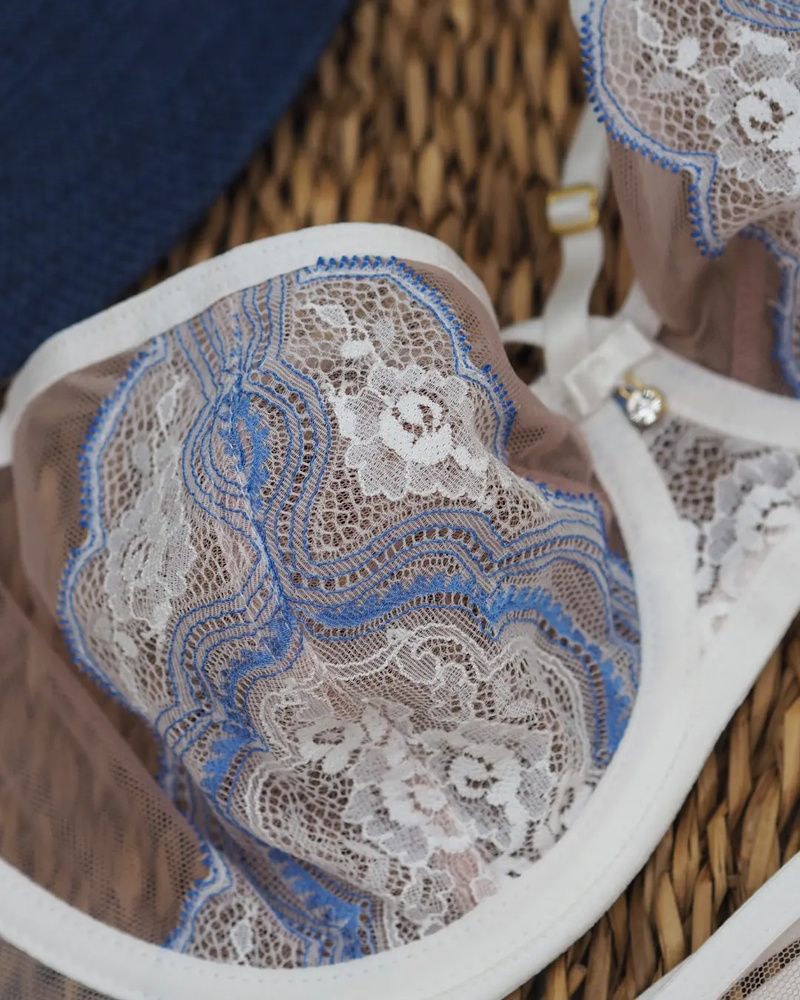 Biustonosz o kroju balkonetki. Miseczki z delikatnej siatki ozdobionej delikatną koronką z błękitną nitką. Dekolt zdobią paseczki z regulacją, konstrukcja unosząca i zbierająca biust do środka.