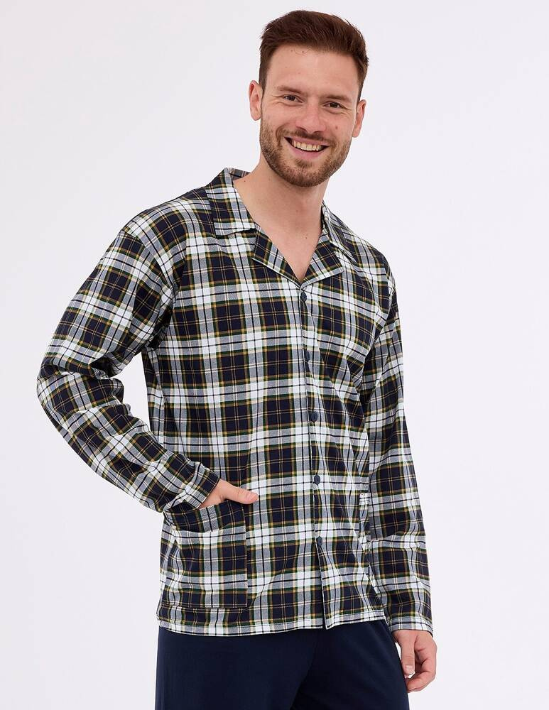 Klasyczna piżama męska uszyta z delikatnej bawełny w kratę. Piżama z długim rękawem, rozpinana, na wysokości bioder kieszenie. Do kompletu długie spodnie z prostymi nogawkami. Piżama pakowana w pudełko.