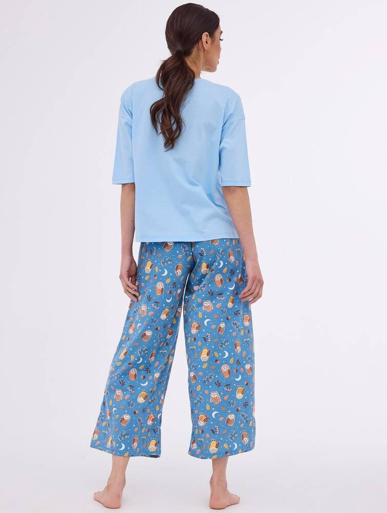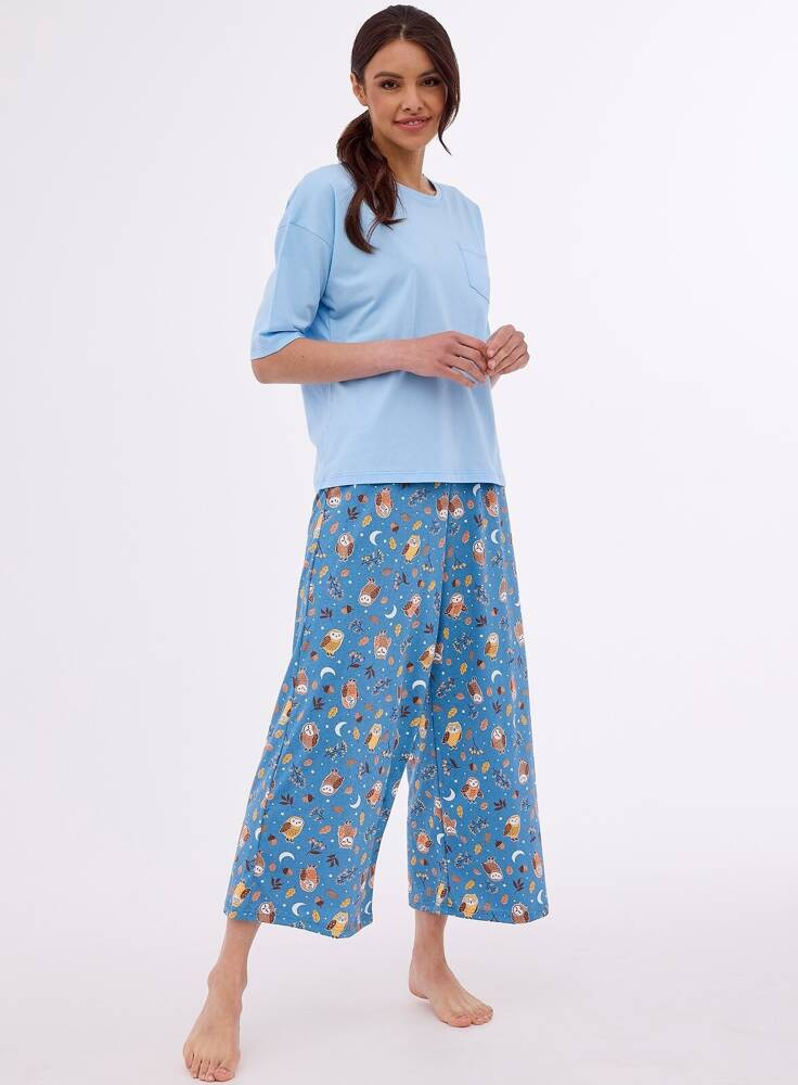 Do kompletu luźne szerokie spodnie 7/8 z ozdobnym wzorem w sowy