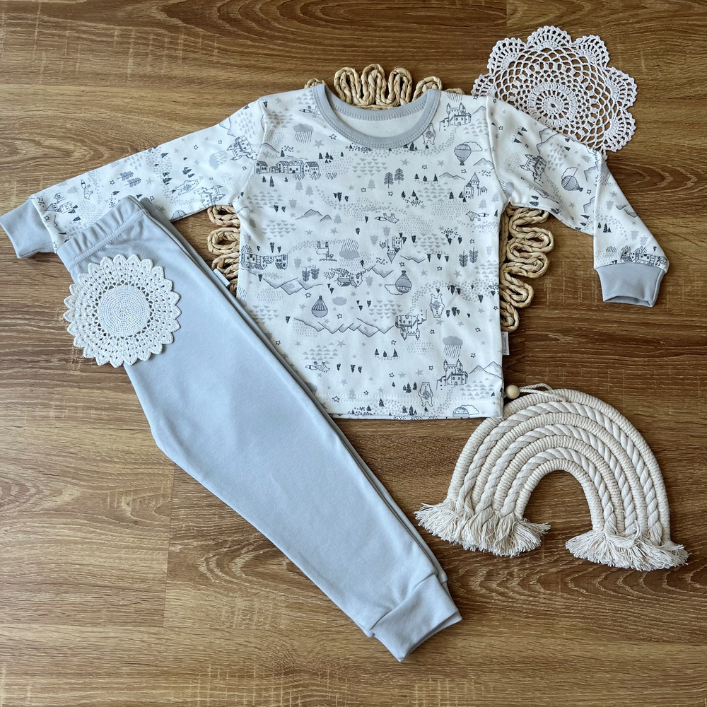 Piżama dziecięca uszyta z wysokogatunkowej bawełny w modny wzór. Bluzka z długim rękawem, do kompletu długie spodnie zakończone ściągaczem.