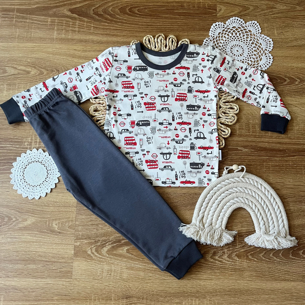 Piżama dziecięca uszyta z wysokogatunkowej bawełny w modny wzór. Bluzka z długim rękawem, do kompletu długie spodnie zakończone ściągaczem.