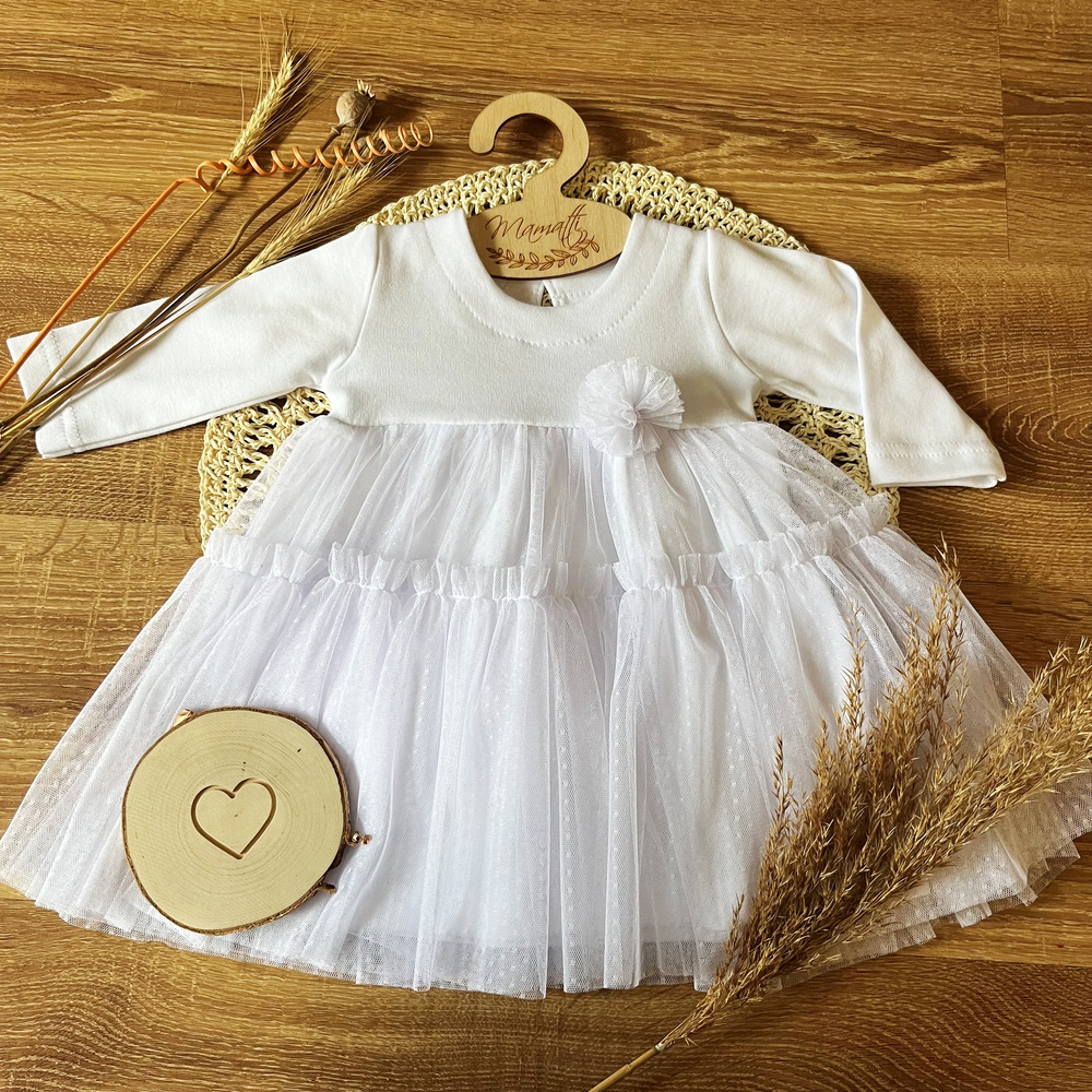 Sukienka niemowlęca połączona z body. Model rozkloszowany z długim rękawem. Uszyta z miękkiej i przyjemnej w dotyku bawełny. Idealna kreacja dla małej damy.