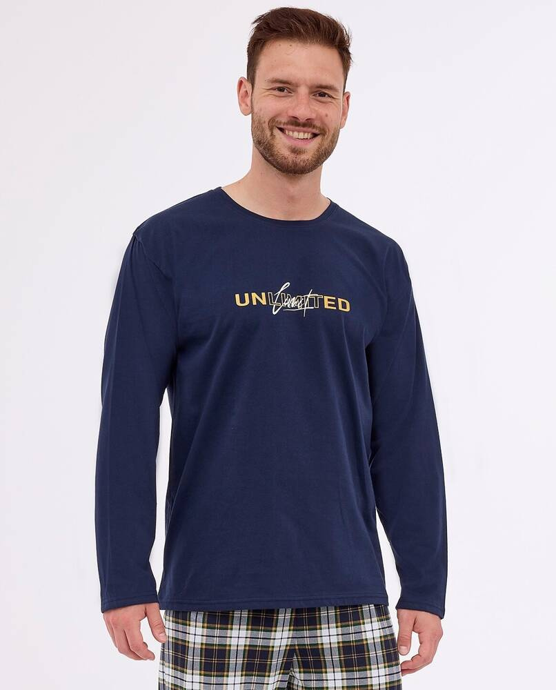 Piżama męska z wysokiej jakości bawełny. Bluza z długim rękawem, dekolt półokrągły. Z przodu ozdobny nadruk. Do kompletu długie proste spodnie w kratę. Pakowana w pudełko.