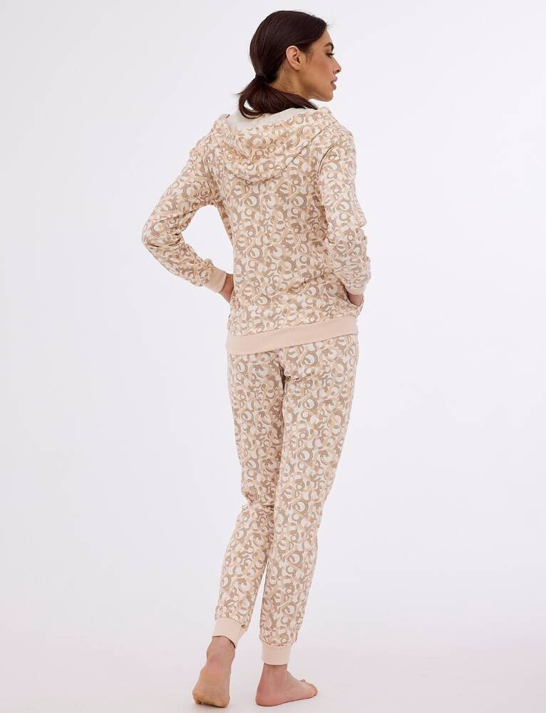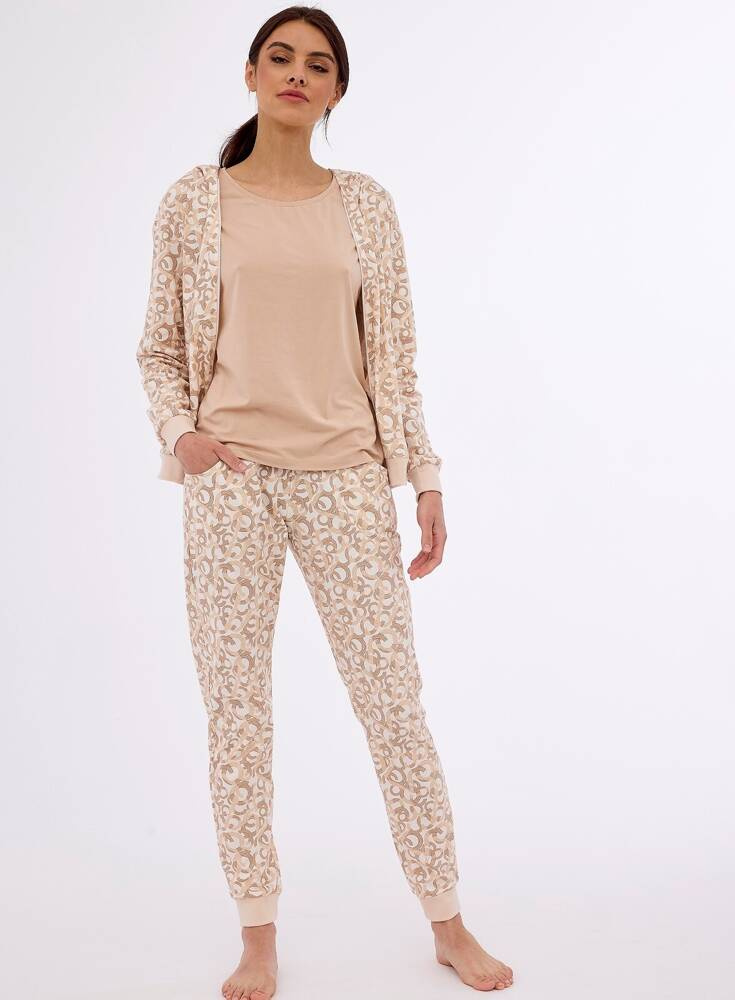 Trzyczęściowa piżama damska wykonana z wysokiej jakości wyjątkowo miłej bawełny Koszulka jednolita z krótkim rękawem. Spodnie długie wzorzyste z wygodnymi kieszeniami,. W komplecie wzorzysta bluza zapinana na suwak z kapturem.