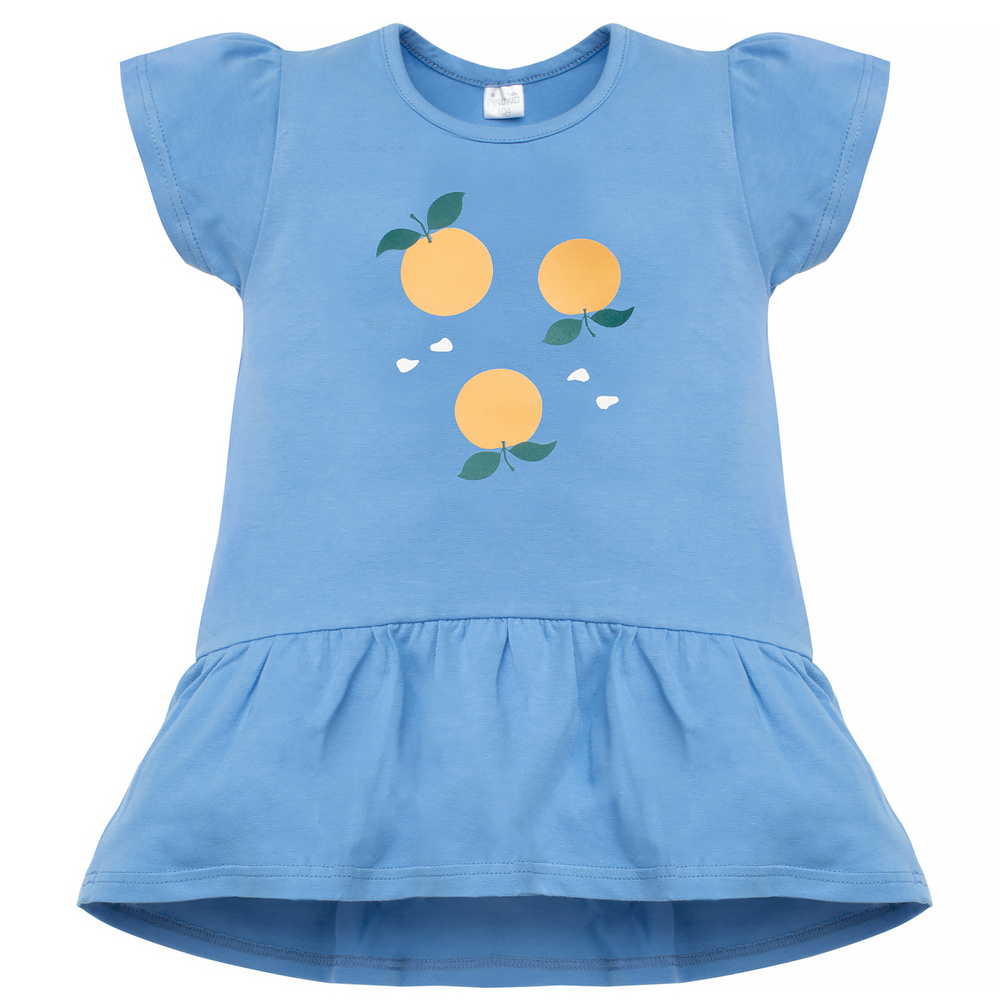 Dziewczęca tunika z krótkim rękawem, uszyta z delikatnej bawełnianej dzianiny w kolorze modnego błękitu, ozdobiona jest wesołym nadrukiem pomarańczy. Dodatek elastanu sprawia, że ubranko jest wygodne w ubieraniu i świetnie układa się na dziewczynce. Dla wygody ubierania, do rozmiaru 86, tunika zapinana jest przy szyi na wygodne, bezniklowe napki. Na dole tuniki znajduje się efektowna falbanka, dodająca dziewczęcego uroku. Rękawki są marszczone u góry, co daje efekt lekkich bufek. Tunika, w zestawie z leginsami, będzie idealną stylizacją do przedszkola lub żłobka. Wyprodukowana jest w Polsce. W kolekcji Fruit and Sun występuje również w kolorze pomarańczowym.