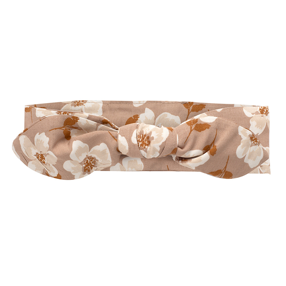 Opaska dla dziewczynki w kolekcje Tres Bien uszyta jest z delikatnej tkaniny wiskozowej w kolorze delikatnego beżu, ozdobionej nadrukiem drobnych kwiatuszków. Opaska wiązana jest z przodu na ozdobną kokardę, takie rozwiązanie sprawia, że opaskę możemy dopasować do głowy dziewczynki. Opaska to niezbędny element każdej dziewczęcej stylizacji. Wykonana jest w Polsce. W kolekcji Tres Bien występuje również w kolorze różowym i szarym.
