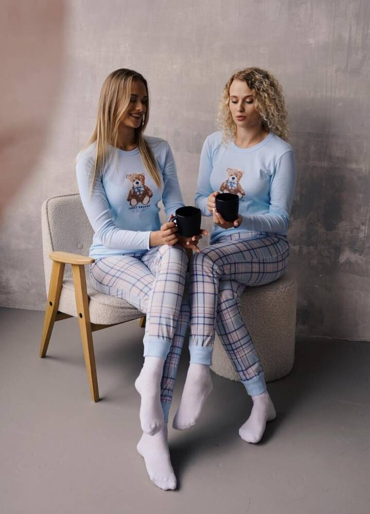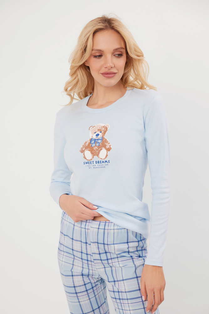 Piżama damska Katrin wyróżnia się lekko dopasowaną linią, która zapewnia komfort noszenia i podkreśla sylwetkę. Bluzka z długim rękawem posiada okrągły dekolt oraz ozdobny nadruk przedstawiający uroczego misia i napis "Sweet Dreams" Italian Fashion by Guazzone. Spodnie o klasycznym kroju, z modnym wzorem w kratę na dole nogawek mają praktyczne ściągacze, które utrzymują spodnie na miejscu i zapobiegają ich podciąganiu się podczas snu.