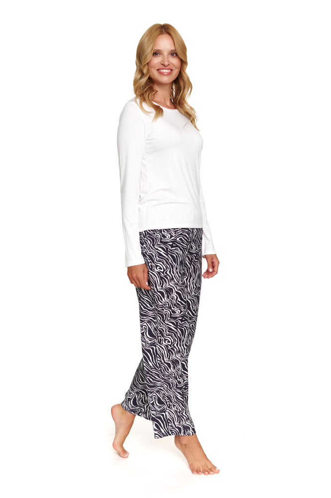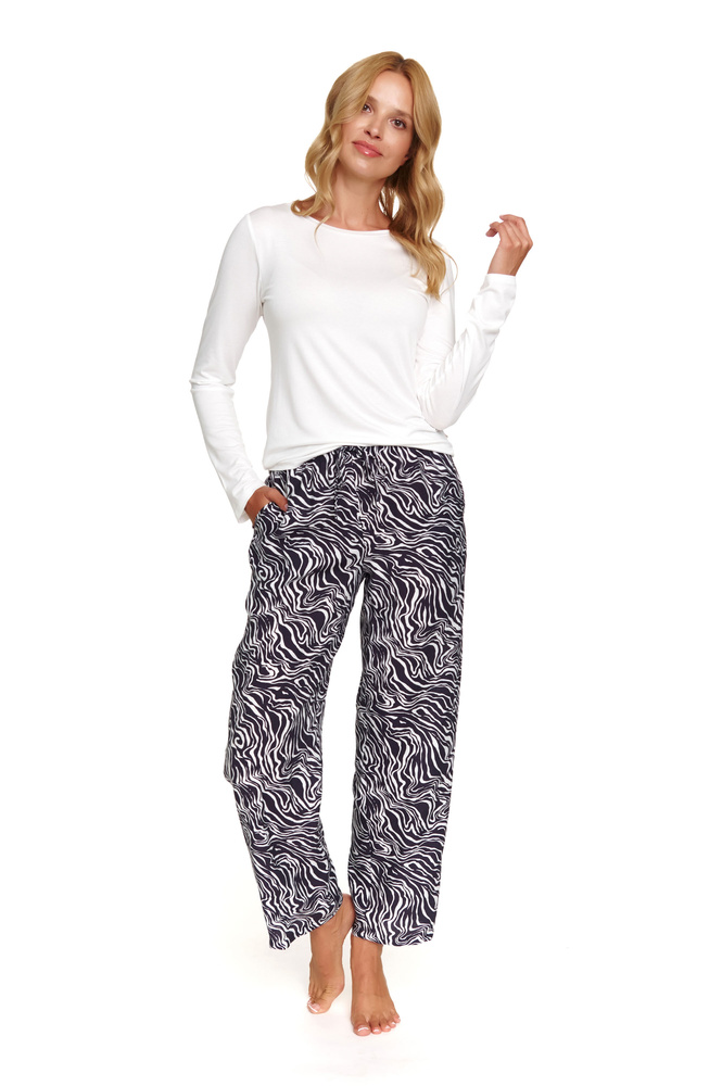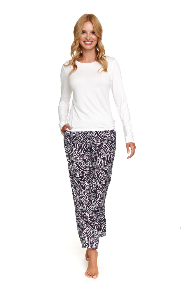 Dwuczęściowa piżamka firmy Doctor Nap wykonana z wysokogatunkowej wiskozy. Idealna na dobry sen i na wspaniały początek dnia przy pierwszej porannej kawie. Luźna bluza z długi rękawem, nie krępuje ruchów i ładnie podkreśla sylwetkę. Spodnie długie, wzorzyste, w pasie wykończone gumką. Przyjemna w dotyku piżama, utrzymana jest w ciekawej kolorystyce.