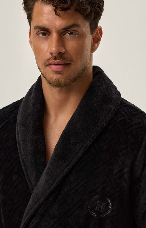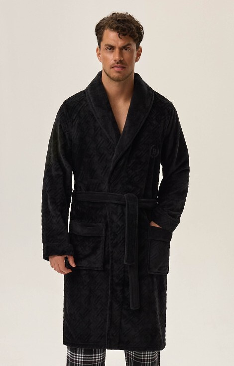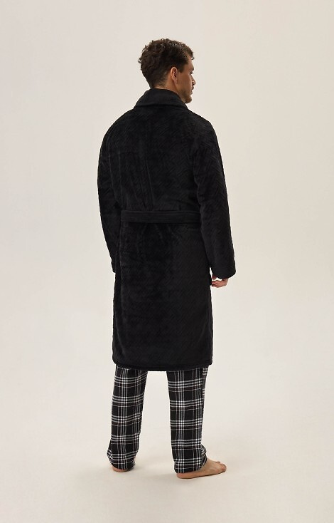 Klasyczny szlafrok męski z szalowym kołnierzem, wykonany z puszystej i wyjątkowo przyjemnej dzianiny. Ozdobiony delikatnym wytłoczonym wzorem.