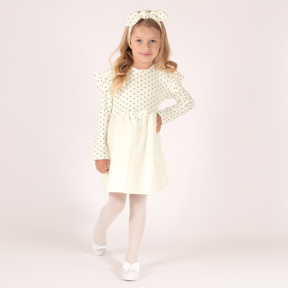 Piękna ponadczasowa sukienka na długi rękaw dla dziewczynki. Góra klasyczna przyozdobiona na ramionach tzw. Motylkami. W tali przyozdobiony kokardą. Zapinana na plecach. Doskonale sprawdzi się w szafie każdej dziewczynki.