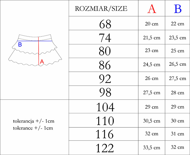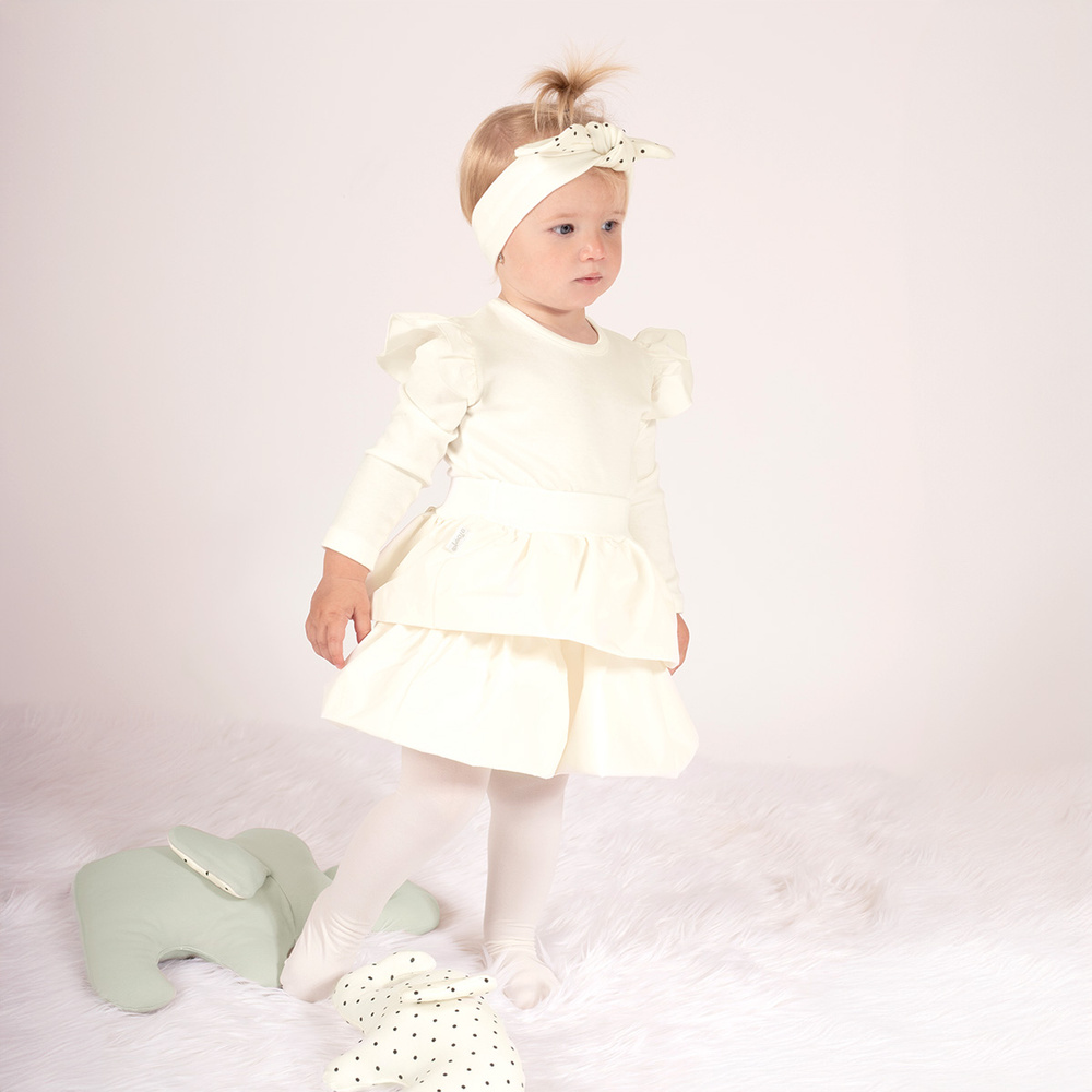 Zapytaj o produktNie krępująca ruchów, wygodna spódniczka wykonana ze 100% kremowej bawełny. Materiał posiada certyfikat Oeko-Tex Standard 100 Tekstylia godne zaufania. W pasie wszyto praktyczną gumkę, ułatwiającą ubieranie. Produkt zdobią dwie marszczone falbanki oraz duża kokarda na przodzie.