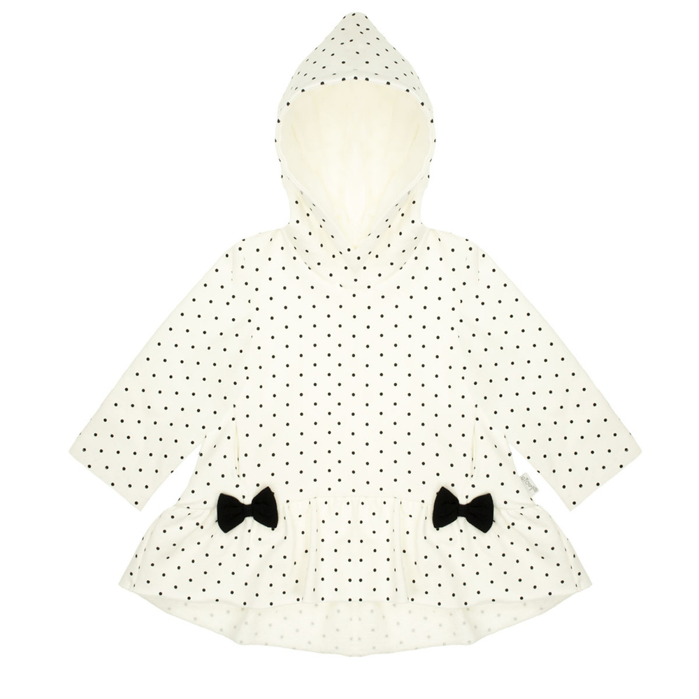 Bluza dresowa dla dziewczynki z kolekcji Lizy. Produkt wykonany w modny wzór kropek. Wnętrze kaptura kremowym,, dół wykończony falbanką i przyozdobiony dwoma czarnymi kokardkami. Na przodzie dwie kieszonki. Zakładana „przez głowę”. Materiał posiada certyfikat Oeko-Tex Standard 100 Tekstylia godne zaufania.