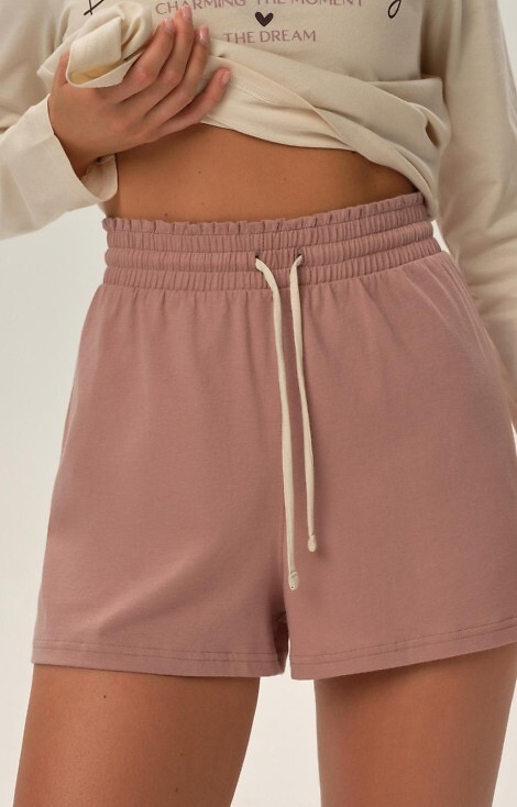 Do kompletu krótkie jednolite spodenki. W pasie szeroka gumka i troczek.