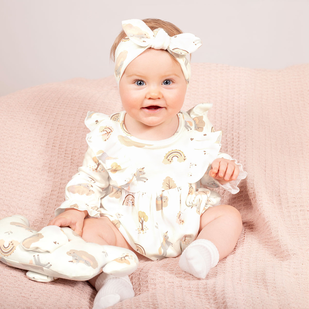 Zapytaj o produktBawełniany rampers dziewczęcy z długim rękawem. Model zdobi uroczy nadruk jednorożców, wykonany trwałą i bezpieczną metodą farb wodnych. Możliwość rozpinania rampersa w kroku i na lewym ramieniu znacząco ułatwia ubieranie i przewijanie dziecka. Zatrzaski wykonano z antyalergicznego, bezniklowego tworzywa. Rampers Rosy to niezbędny element letniej garderoby maluszka. Doskonale sprawdzi się podczas wakacyjnych wyjazdów i wiosenno-letnich spacerów.