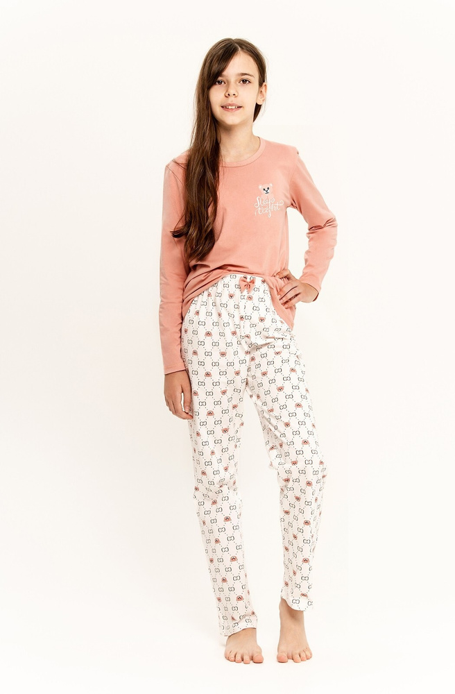 Piżama dziewczęca bawełniana, koszulka z długim rękawem oraz ozdobnym nadrukiem. Do kompletu długie spodnie