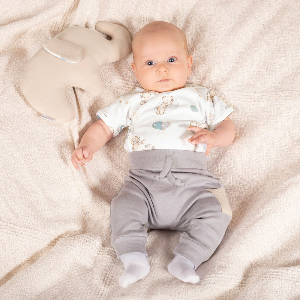 Zapytaj o produktModne spodnie dla chłopca z kolekcji Teddy w popielatym kolorze. Z boku na nogawce naszyta kieszonka w bezowej kolorystyce. Materiał jest całkowicie bezpieczny dla skóry dziecka. Pas i mankiety w nogawkach wykończone zostały z tego samego materiału. Spodnie posiadają gumkę w pasie od rozmiaru 68. Przy pasie ozdobne sznureczki.