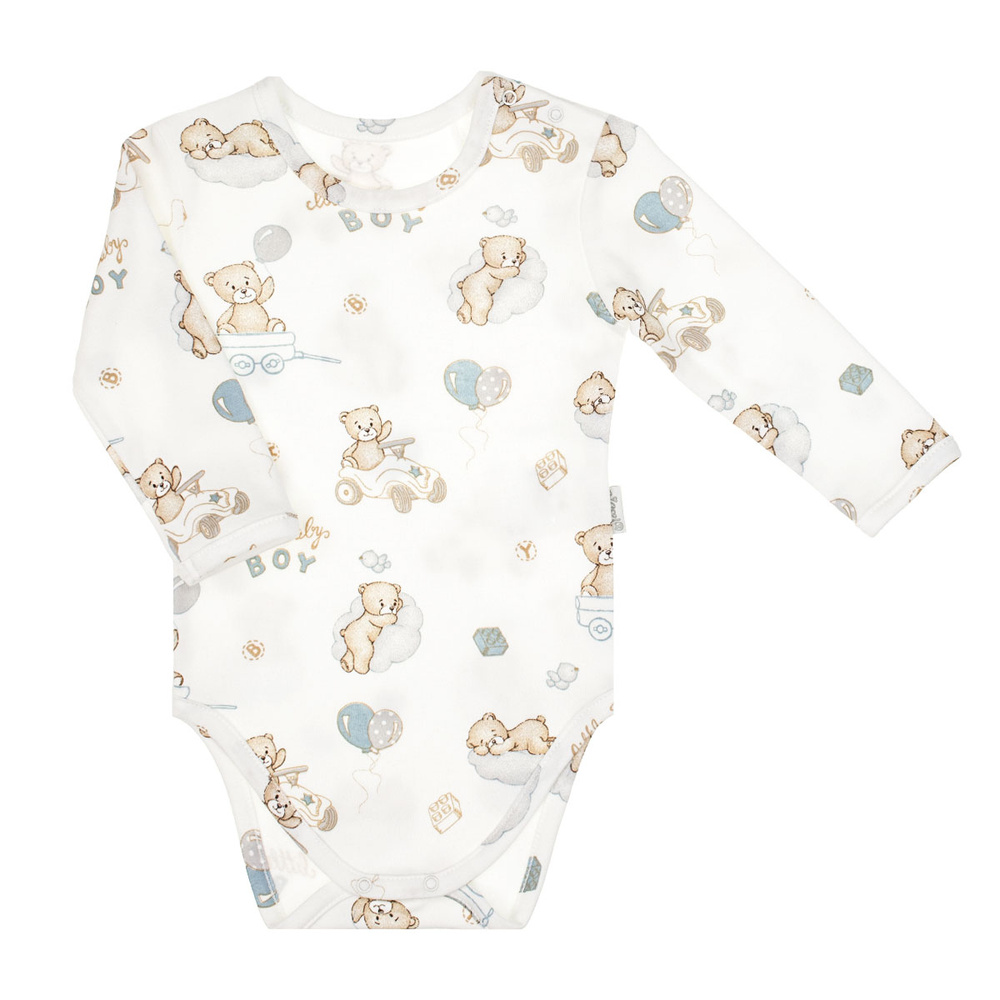 Zapytaj o produktBody z długim rękawem dla chłopca, uszyte kremowej bawełny w misie z napisem „little baby boy”. Materiał posiada certyfikat Oeko-Tex Standard 100 Tekstylia godne zaufania. Produkt zapinany na ramieniu i w kroku na bezniklowe napy, zapewniając komfort przy ubieraniu.