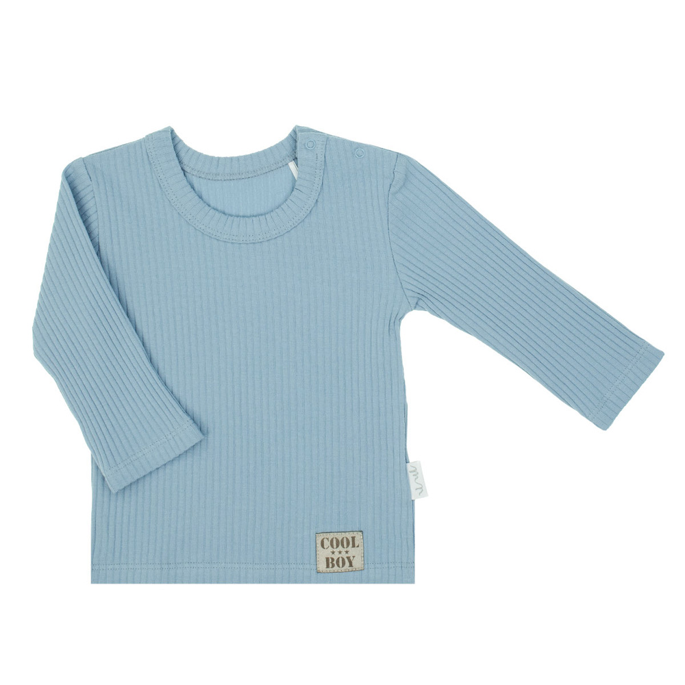 Zapytaj o produktNiebieska bluzka z długim rękawem uszyta z prążka, z przodu naszyta ozdobna naszywka Cool Boy. Materiał posiada certyfikat Oeko-Tex Standard 100 Tekstylia godne zaufania. Ubranko posiada praktyczne napy na ramieniu ułatwiające ubieranie do rozmiaru 104.