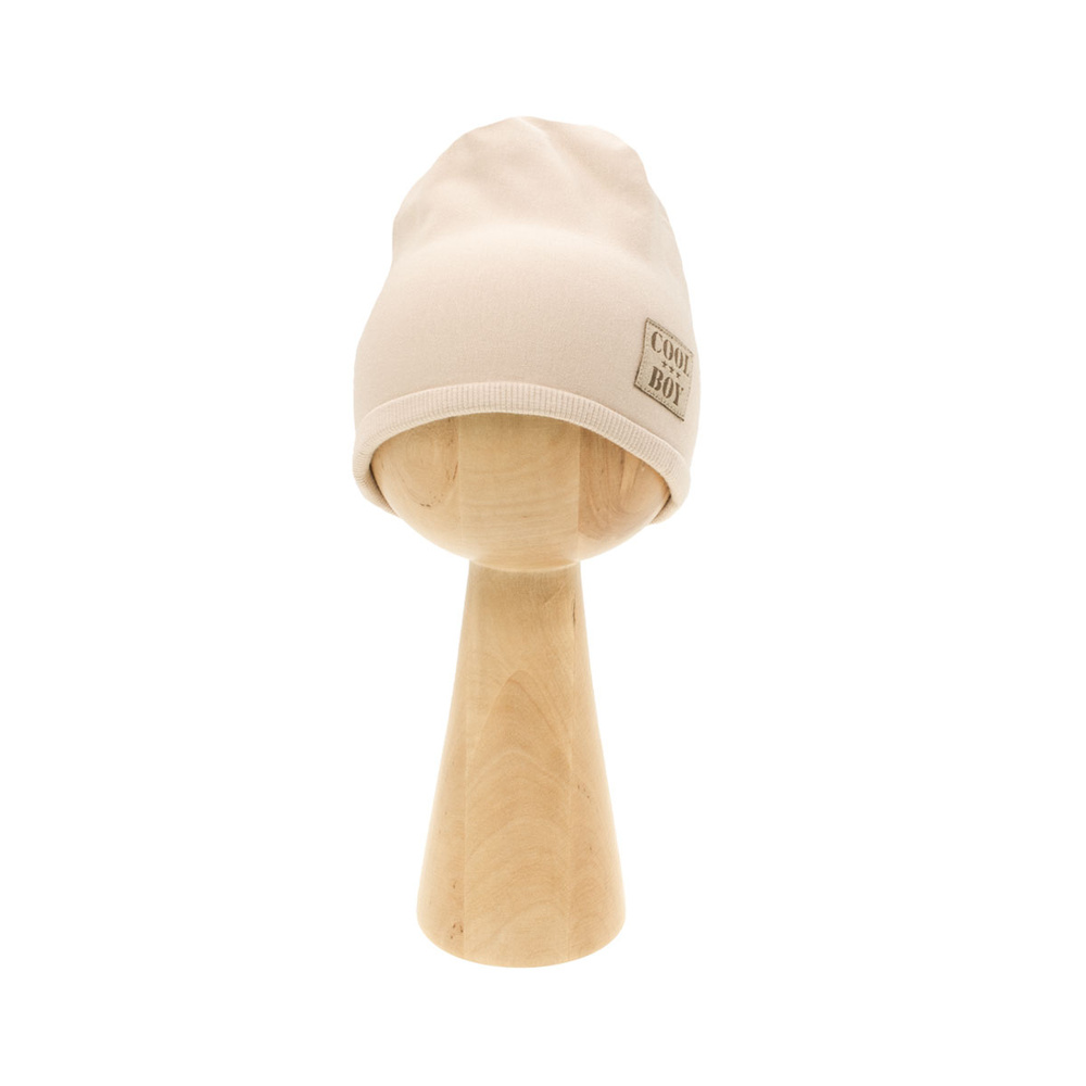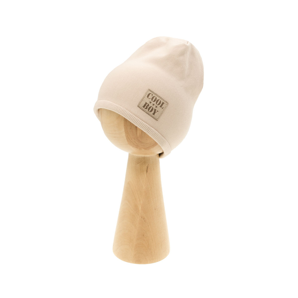 Zapytaj o produktModna czapka, smerfetka dla chłopca, wykonana z beżowej bawełny dresowej z niewielką ilością elastanu. Od środka podszyta bezową podszewką, ozdobna naszywka Cool Boy. Materiał posiada certyfikat Oeko-Tex Standard 100 Tekstylia godne zaufania. Fason jest wygodny i praktyczny, będzie pasował na każdą główką dziecka.