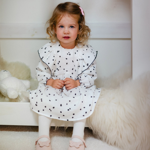 Sukienka dziecięca uszyta z miękkiego i przyjemnego w dotyku muśliny. Sukienka zapinana na guziczek z tyłu. Elementem ozdobnym są falbanki wszyte w ramionkach.