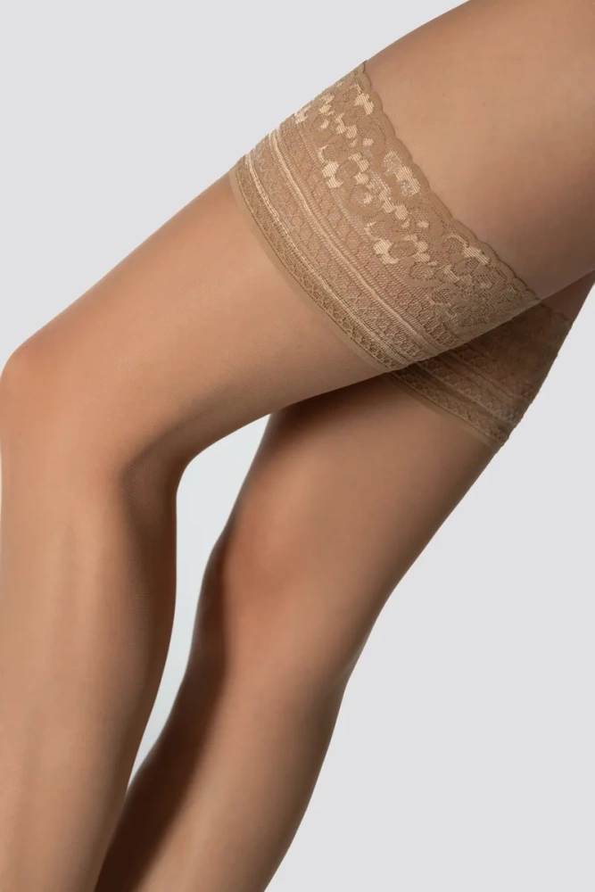 Kobiece i eleganckie pończochy samonośne to doskonała propozycja dla kobiet, którym zależy na nienagannym i zmysłowym wyglądzie. Pojedynczy oplot zwiększa wytrzymałość pończoch oraz sprawia, że są one bardziej odporne na zaciągnięcia. Pończochy nie posiadają zaznaczonej części palcowe. Ozdobna koronka z podwójnym silikonem zapewnia komfort noszenia i sprawia, że pończocha przez cały czas znajduje się w odpowiednim miejscu na nodze i nie opada.