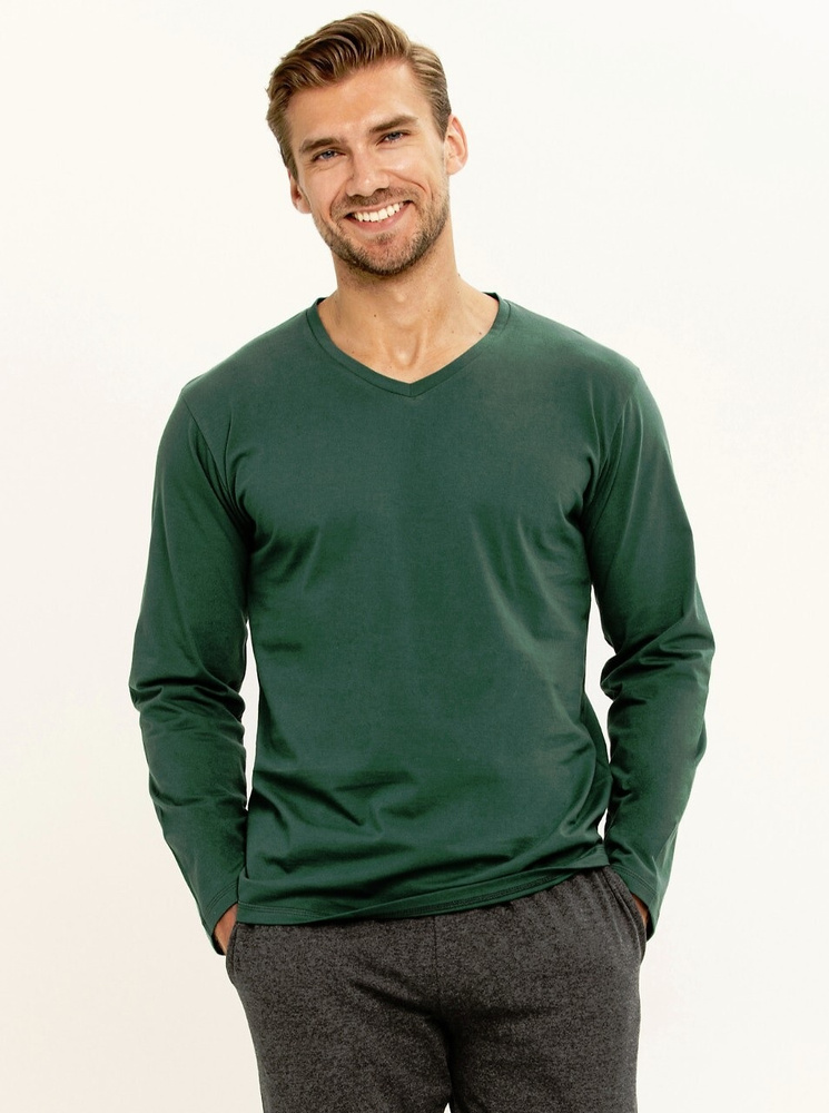 Piżama męska z wysokiej jakości bawełny.  Koszulka  z długim rękawem, dekolt w szpic. Spodnie długie , wzorzyste