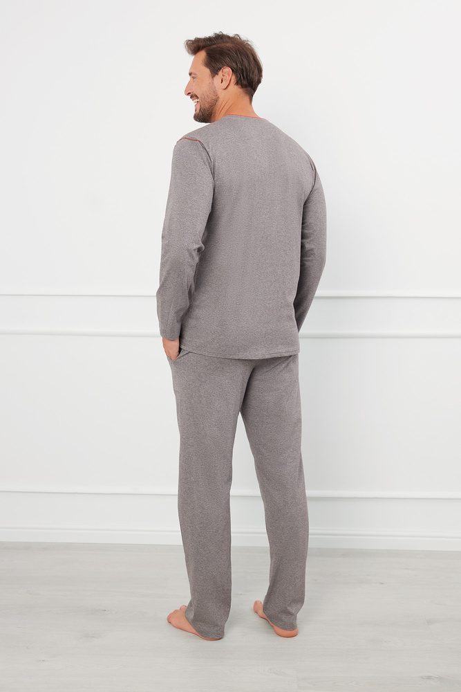 Nowoczesna piżama męska o bardzo uniwersalnym kroju. Składa się z bluzki z dekoltem w serek oraz spodni z długimi nogawkami i praktycznymi kieszeniami po bokach. Całość posiada prosty, komfortowy fason. Piżama męska z długim rękawem wyróżnia się za sprawą kontrastowych detali na lamówce i przy ramionach. Uszyta została z miękkiej, oddychającej bawełny.