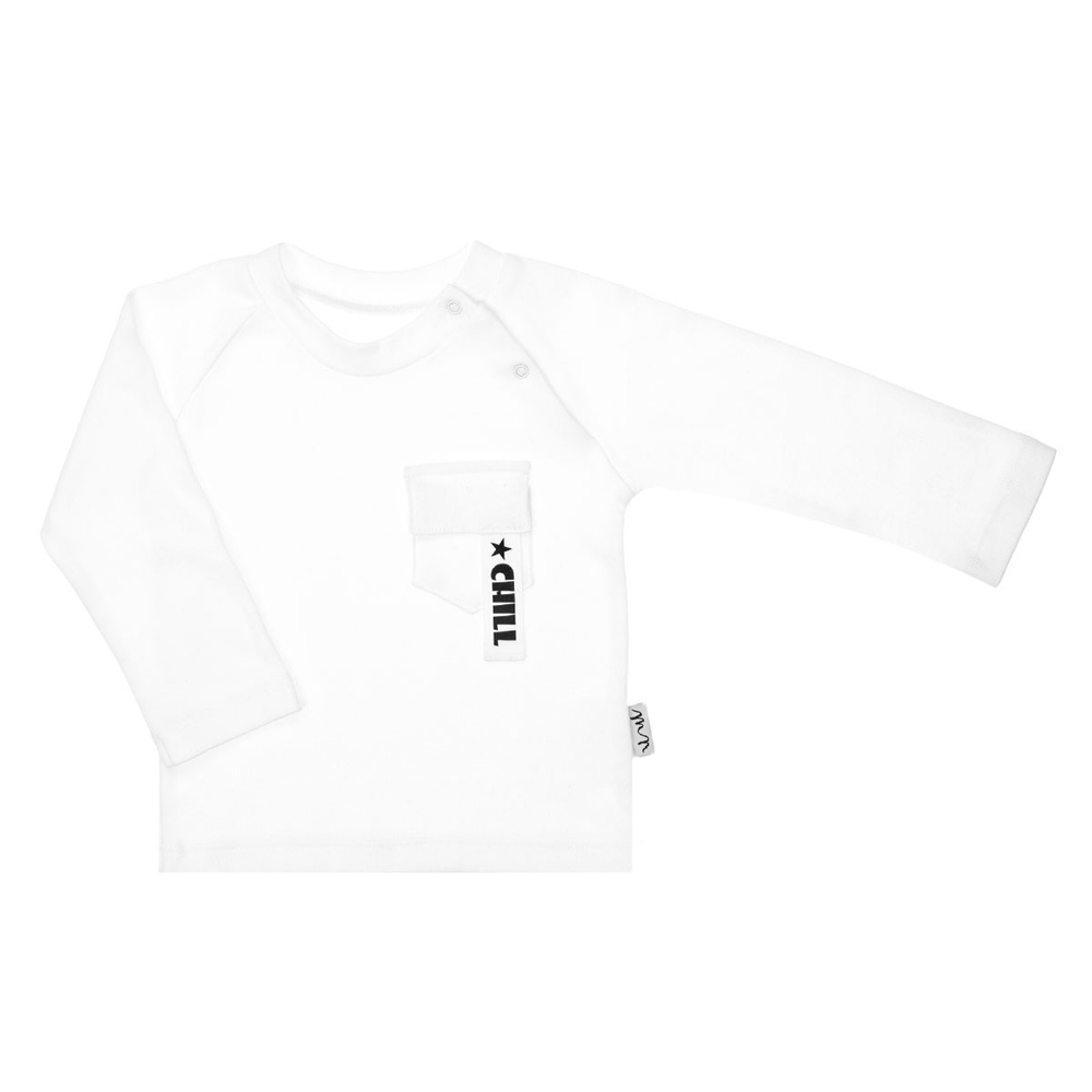Zapytaj o produktBiała bluzka z długim rękawem wykonana z bawełny. Z przodu kieszonka. Materiał posiada certyfikat Oeko-Tex Standard 100 Tekstylia godne zaufania. Ubranko posiada praktyczne napy na ramieniu ułatwiające ubieranie do rozmiaru 104.