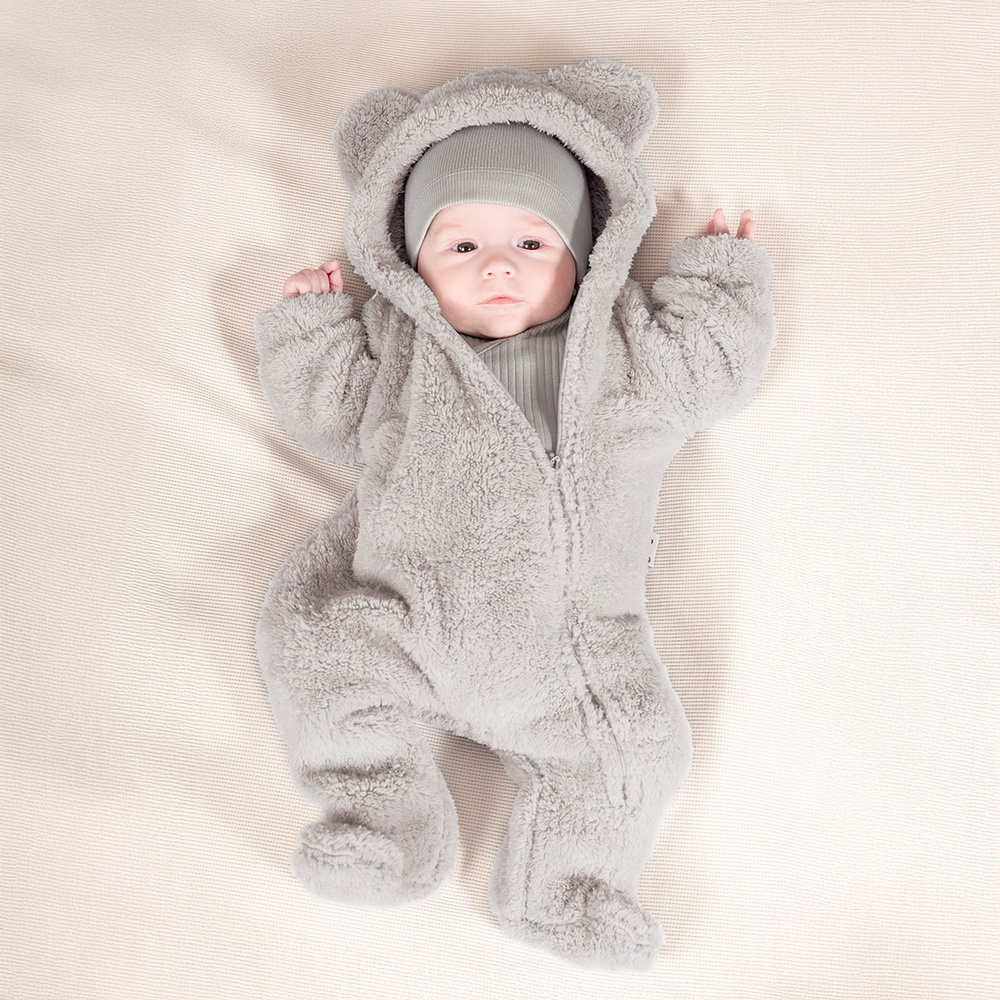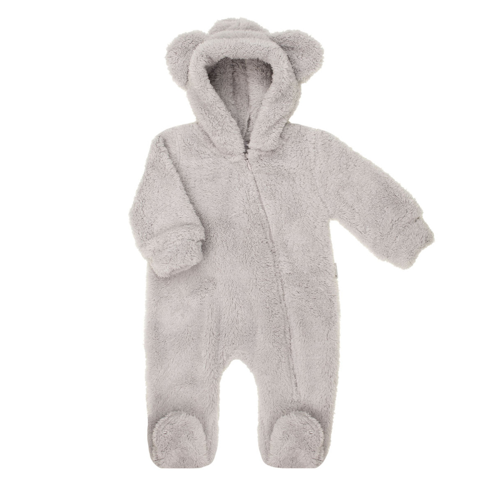 Pajac uszyty z miłego w dotyku futerka tzw. luny. Wykonany w szarej kolorystyce. Idealnie sprawdzi się na zimne dni. Całość zdobi kaptur z uszkami. Zapinany na zamek, co ułatwia ubieranie dziecka. Materiał jest całkowicie bezpieczny dla skóry dziecka.