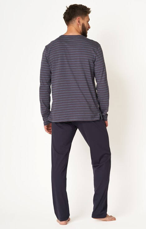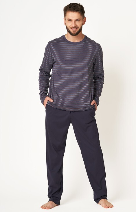 Piżama męska wykonana z wysokiej jakości miękkiej bawełny. Model o klasycznym kroju. Koszulka w paski z długim rękawem, dekolt okrągły. Spodnie długie, jednolite z wygodnymi kieszeniami. Spodoba się najbardziej wymagającym mężczyzną