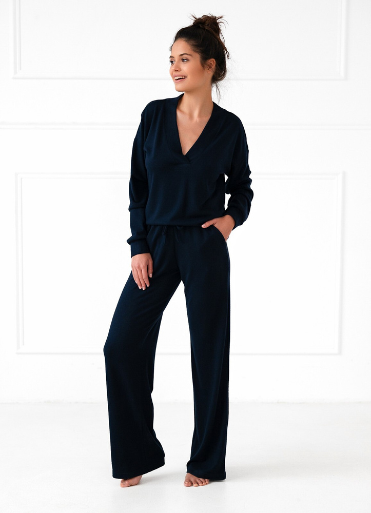 Komplet damski typu homewear. Wykonany z wysokiej jakości dzianiny z dodatkiem wiskozy. Koszulka z długim rękawem, dekolt typu V. Do kompletu luźne, długie spodnie. W pasie gumka.