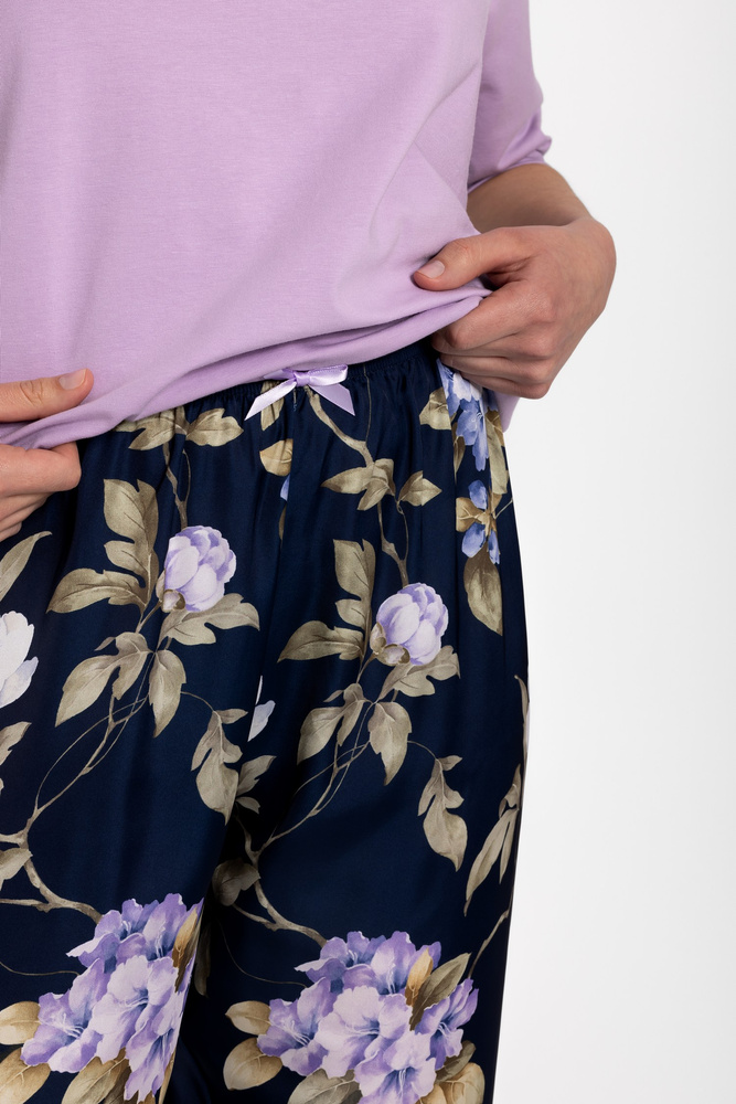 Elegancka i stylowa piżama damska. Dekolt typu U, rękaw 3/4. Spodnie długie wykonane z wysokiej jakości włoskiej satyny, w pasie gumka. Zaprojektowana i uszyta w Polsce. Idealna również jako homewear.