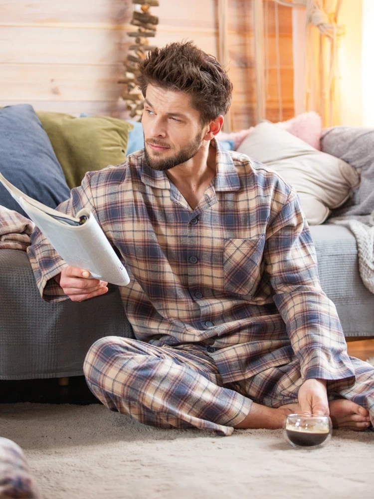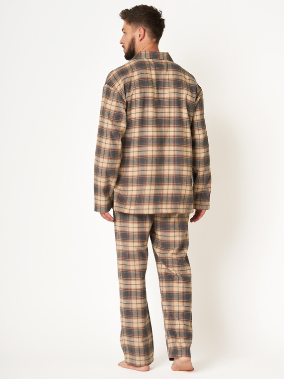 Piżama męska wykonana z wysokiej jakości miękkiej bawełny flanelowej. Koszulka zapinana na guziki z długim rękawem.
